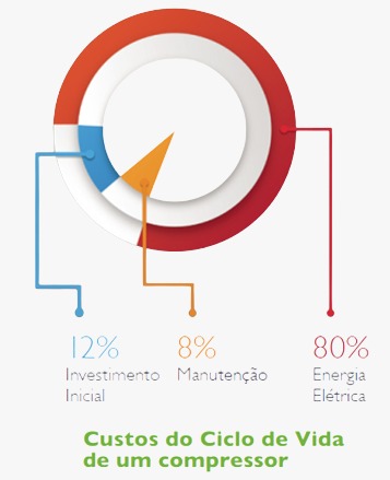 Para se ter ar comprimido é necessário um compressor de ar, onde seu principal custo ao longo dos anos é energia elétrica, cerca de 80% dos valores gastos em uma instalação de ar comprimido, conforme gráfico a seguir: